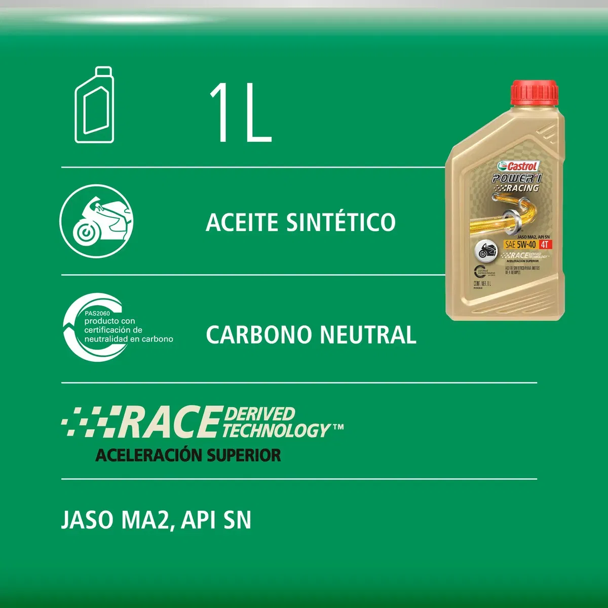 El aceite Castrol Power 1 Racing 4T es un lubricante de motor totalmente sintético para motos modernas con motor 4 tiempos y de alto rendimiento desarrollado para motociclistas que aman la conducción. Una conducción decidida somete al motor a una gran presión, lo que conlleva mayores pérdidas por fricción. El aceite 100% sintético Castrol Power 1 Racing posee Race Derived Technology, que demostró mantenerse resistente y proporcionar más aceleración en condiciones de conducción en circuito.